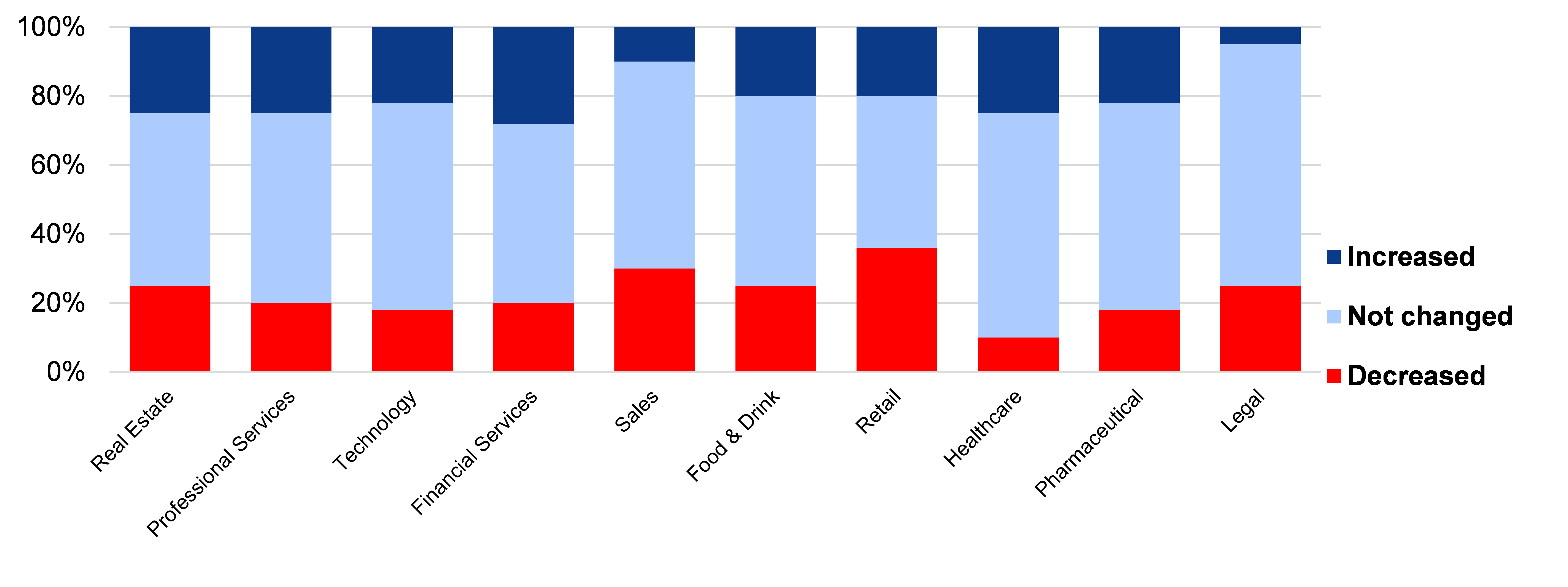 Regarding the overall productivity during Covid-19, 54% of companies say they did not notice a change in productivity, 22% say productivity decreased and 24% state that they increased productivity since working from home during Covid-19. In figure 1 you can see that the Professional Services sector is more or less on par with these productivity results, however sales activities and the legal sector report more productivity losses. The general rule of thumb is that the more experienced an employee is, the lower the productivity decrease is.