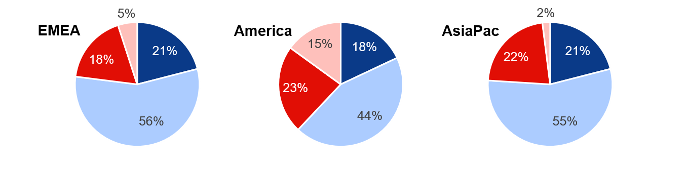 The most popular workspace at home is an enclosed room dedicated to work (37%), closely followed by the living room (35), then bedroom (18%), kitchen (15%) and other (14%). However, bear in mind that a separate room to work in is not available to many. The more developed a region is, the easier working from home gets. And as a result, more support staff in the US report a better work-life balance then for example in APAC.
